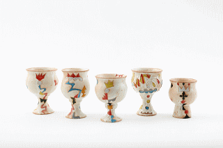〇や角の大皿、碗、湯呑、カップ類、酒器類、豆皿、に至るまで、一貫して、素材は薄い黄色地、あらゆる作品にポップな色、形の絵が施してある。適度に軽く、長年使っても飽きない。