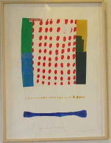 丸、三角、四角、や服などの不定形の画布に 人や木、花、空、雲・・ あるいは抽象的な模様やカタチが 自由にのびのびと描かれている。 赤、白、青、黄、緑・・ などの色は鮮やかで若々しい。